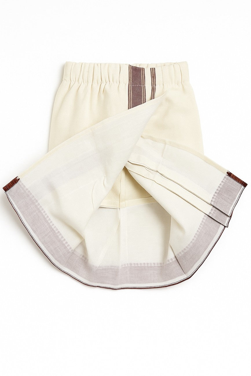 Bring home the charm of tradition with our pre-stitched veshti, thoughtfully designed for little ones to enjoy both comfort and culture. Crafted from 100% breathable cotton, this veshti comes with attached shorts and inner pleats, making it easy to wear and perfect for festive occasions.